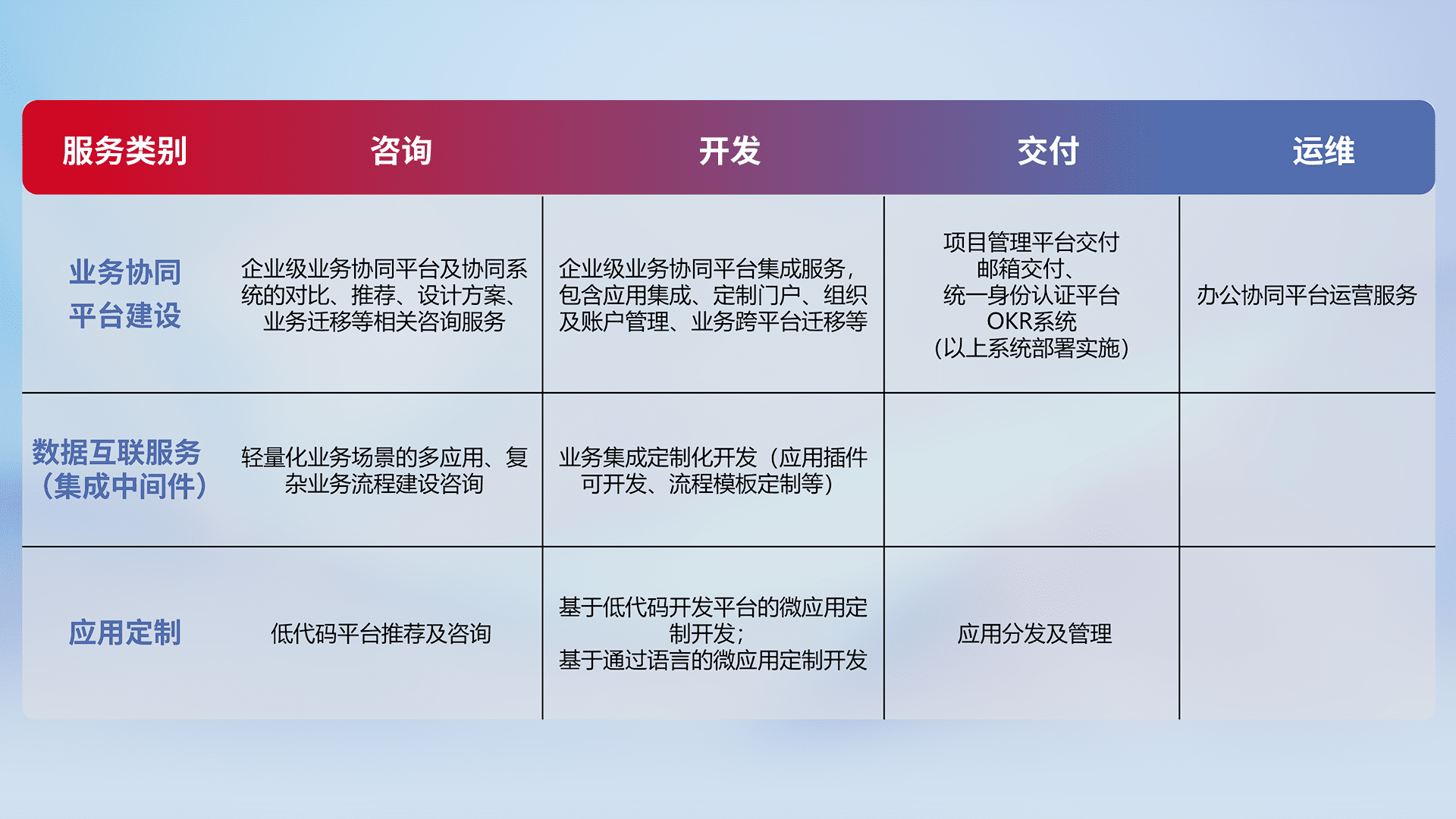 针对钉钉、、、、企微、、IDaas等平台级产品提供产品的规划、、、、方案、、、交付、、定制化开发等服务,,,,实现如统一协同办公、、智能客户服务、、、混合会议管理、、、智能数据查询、、、等业务场景,,,,实现数字化转型。。。。