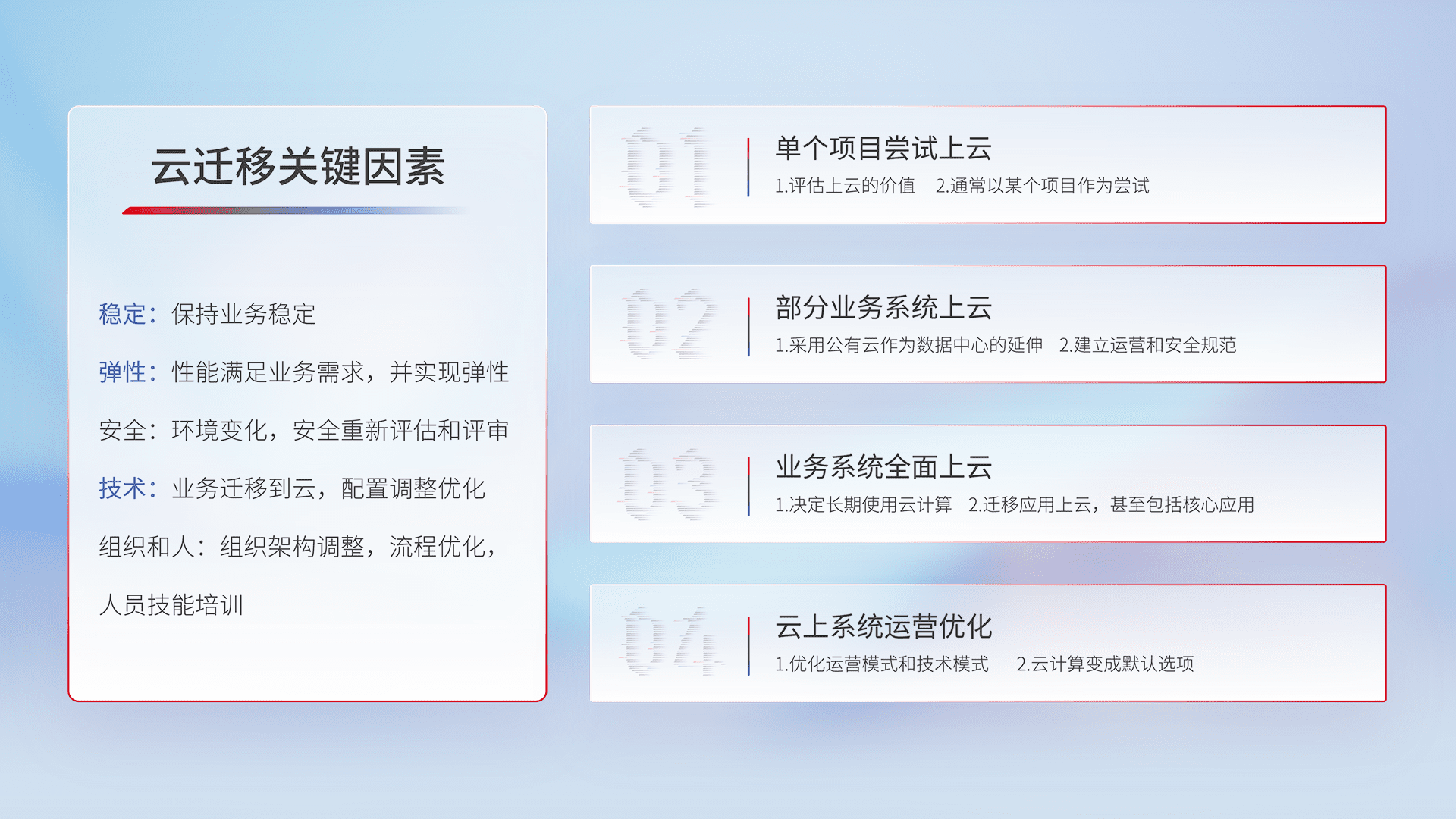 结合实际业务,,从规划设计、、、云平台选型、、云原生改造、、数据迁移、、集成交付,,迁移全过程为客户识别最佳上云路径,,做好风险识别管理,,设计网络架构、、、身份权限、、安全审计合规、、操作审计、、、、日志审计、、监控告警策略、、、多站点容灾设计等,,对云上基础设施进行整体规划,,,,提升IT治理水平,,以满足弹性、、、高可用、、、高性能的需求。。